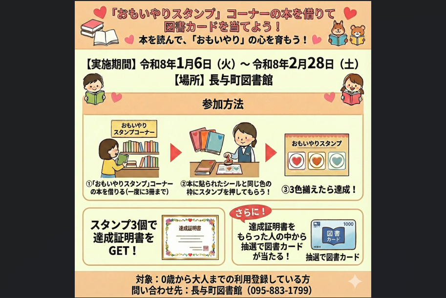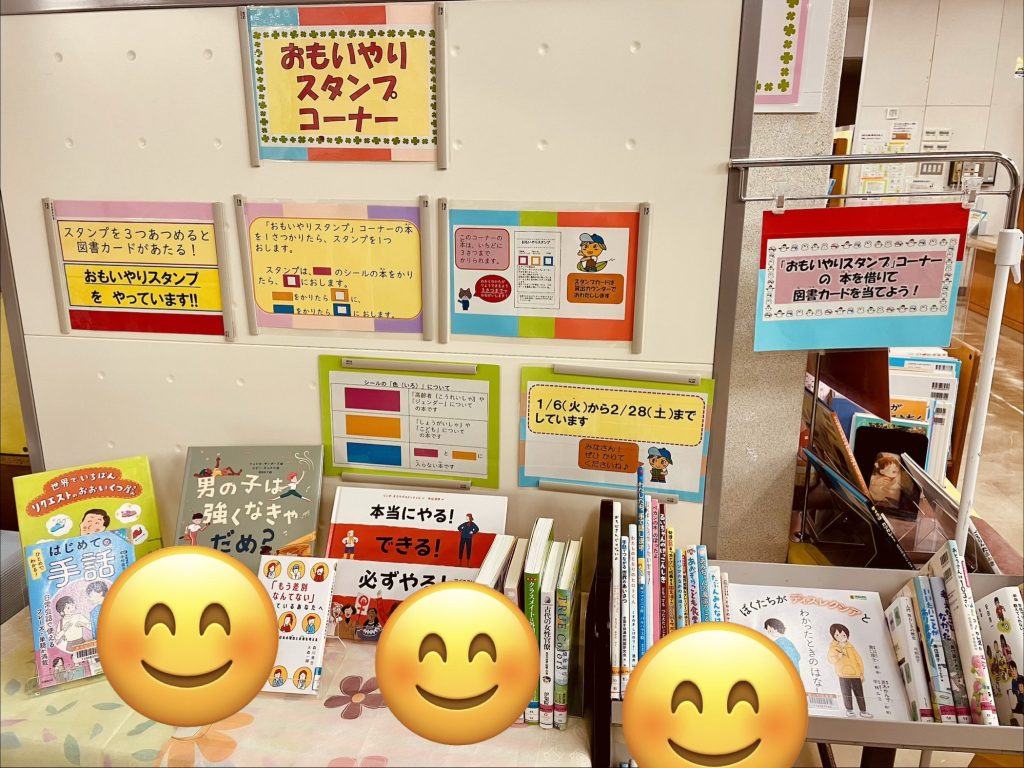 『おもいやりスタンプ』コーナーにある本を借りてスタンプを3種類貯めると、抽選で図書カードが当たります♬